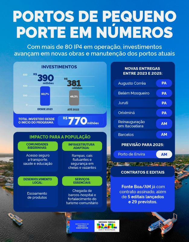 Hoje, há mais de 80 instalações portuárias de pequeno porte em operação na região amazônica, administradas pelo Departamento Nacional de Infraestrutura de Transportes (Dnit). E novas unidades continuam sendo entregues. Em junho deste ano, após uma completa revitalização que custou R$ 11 milhões, entrou em operação a IP4 de Itacoatiara Antigo (AM). Em agosto foi a vez da nova IP4 de Barcelos (AM), com investimentos de R$ 20 milhões e a expectativa de beneficiar cerca de 20 mil moradores. Ainda em 2025, está prevista a entrega do porto de Envira (AM), que recebeu investimento de R$ 37,6 milhões.