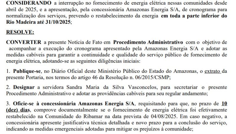 O MP-AM determinou a expedição de ofício à empresa para que, em 10 dias, comprove se o fornecimento já foi restabelecido na Comunidade do Ribamar, inicialmente prevista para receber energia em 4 de agosto. Caso a meta não tenha sido cumprida, a empresa deverá apresentar justificativa técnica detalhada, indicar novo prazo e relatar medidas emergenciais para mitigar os prejuízos aos moradores.