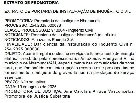 Nesta semana, na última terça-feira, 19 de agosto, a Promotoria de Justiça de Nhamundá instaurou o Inquérito Civil nº 254.2025.000086, com o objetivo de investigar irregularidades graves na prestação do serviço de energia elétrica no município, principalmente nas comunidades da zona rural. A promotora de Justiça substituta Ana Carolina Arruda Vasconcelos é a responsável pelo caso.